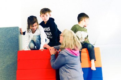 Die Kinder finden über das lustvolle Spielen und Bewegen in Beziehung zum Anderen, hin zu tiefer Rückversicherung gegenüber ihren Ängsten. Sich fallen lassen und aufgefangen werden – nicht nur der Körper, auch die Emotionen. Sich verstecken und gefunden werden. Das sind nur einige Spiele, die die Kinder aus sich heraus in unserem Raum spielen. In diesen Spielen sind tiefgreifende Fragen verborgen: